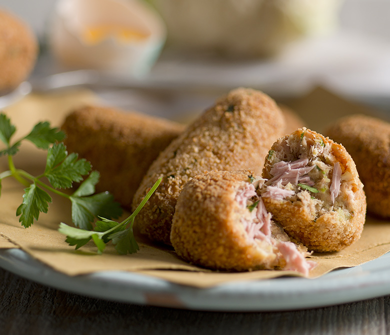 3. Šiek tiek sudrėkintomis rankomis suformuokite norimo dydžio tuno rutuliukus ir išvoliokite juos džiūvėsėliuose, kad visas rutuliukas jais pasidengtų.